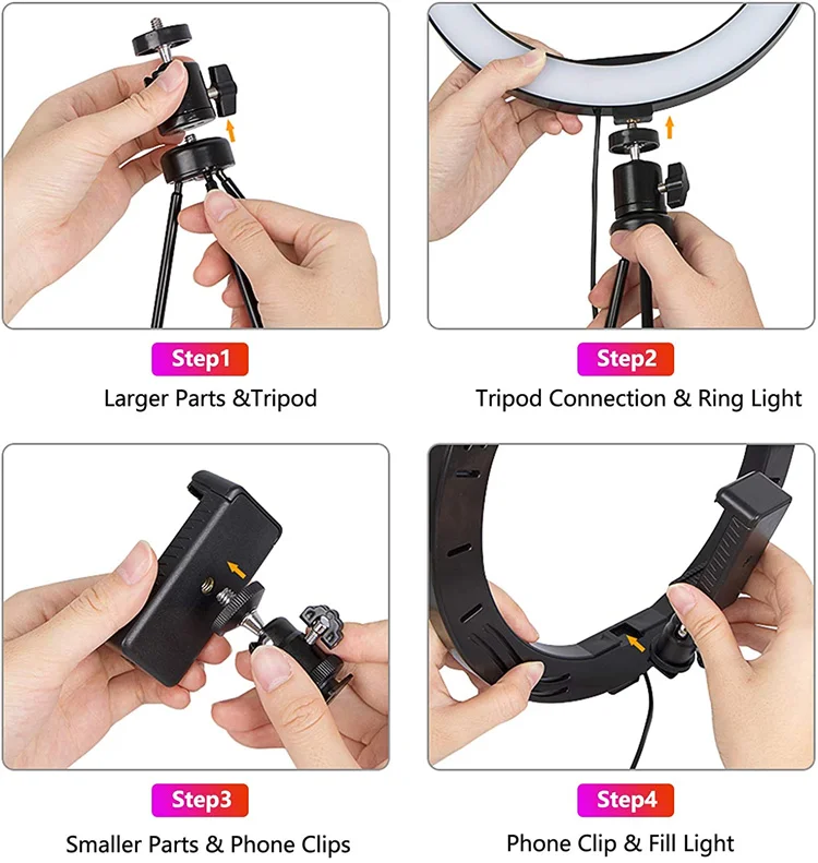 Illuminate your mobile photography with this versatile LED ring light, available in 16, 12, 10, and 6-inch sizes. Featuring 26 adjustable RGB colors, it allows precise control over lighting to enhance your videos and photos. Designed for mobile cameras, it provides consistent, even illumination that reduces shadows and highlights your subject with professional-quality light. Ideal for content creators seeking dynamic color options and superior brightness in a compact, easy-to-use design.