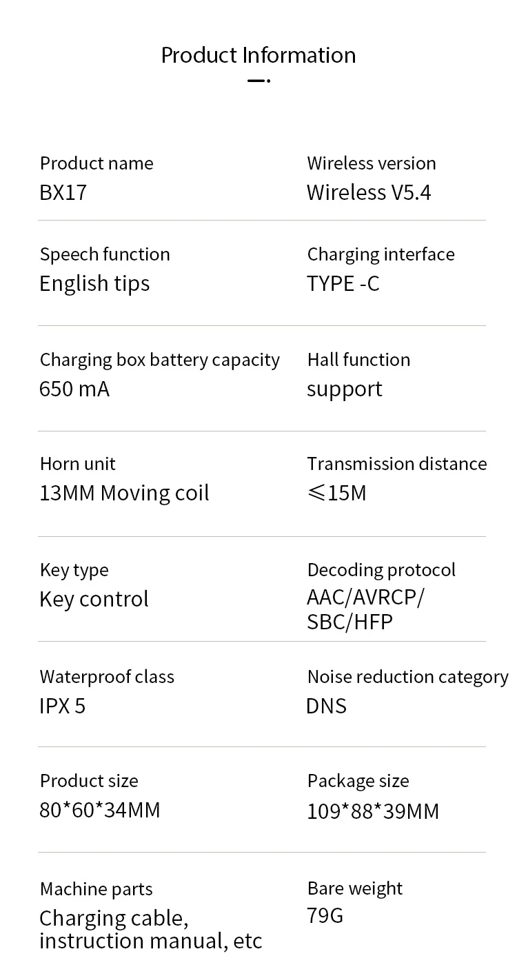 1, ANC and ENC dual noise reduction technology, it protects you from winds and background noise effectively 2,Power consumption is as low as 5mAh only, equipping with 50mAh battery capacity, the device can work up to 8 hours 3, Pressure sensitive button, replacing the traditional mechanical and touch style butto 4,Smart auto pairing mode, matching with wireless 5.2 transmission standard 5, 8-digits digital tubes, all-round power display, capturing remaining battery level at a glance 6, Low latency mode(the latency of gaming mode is as low as 40ms) 7, 14mm compound film speaker, better recovers music tempo 8, IPX6 waterproof level
