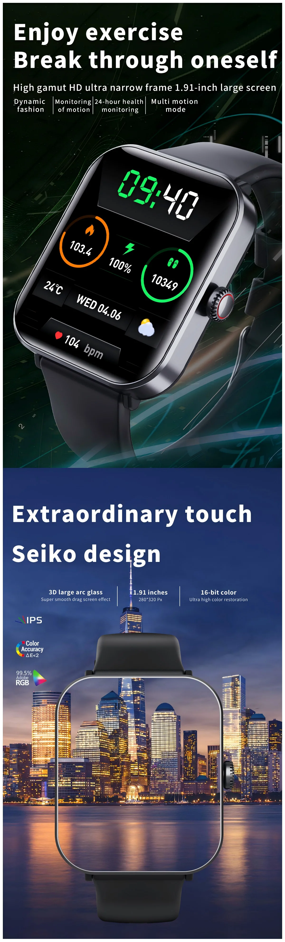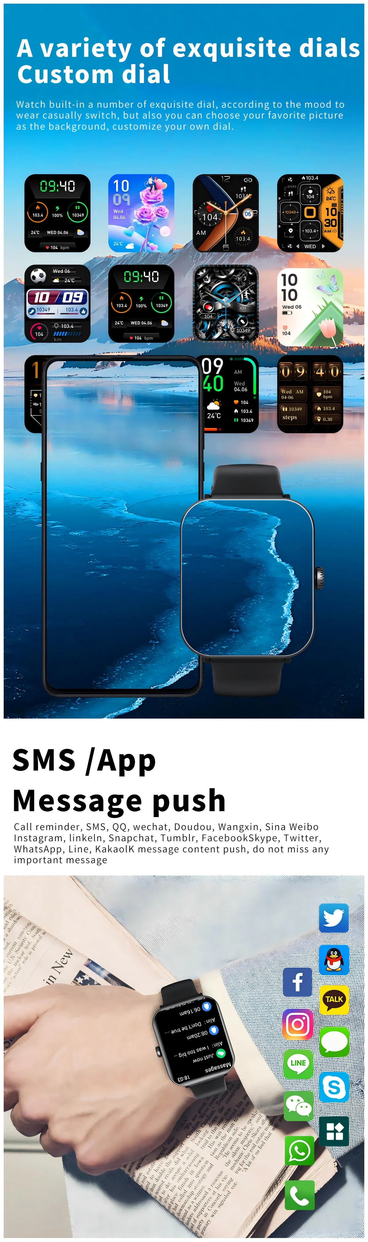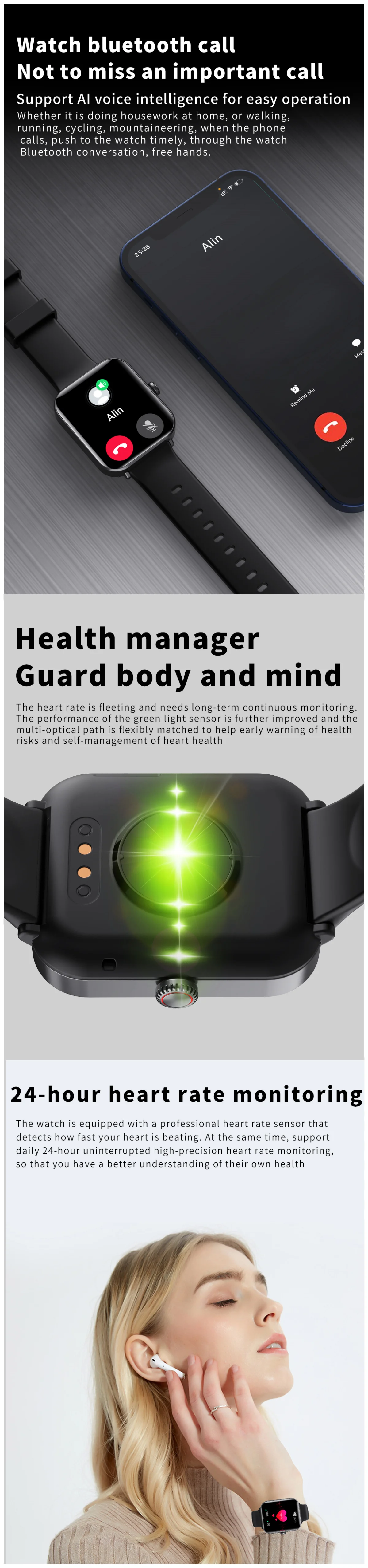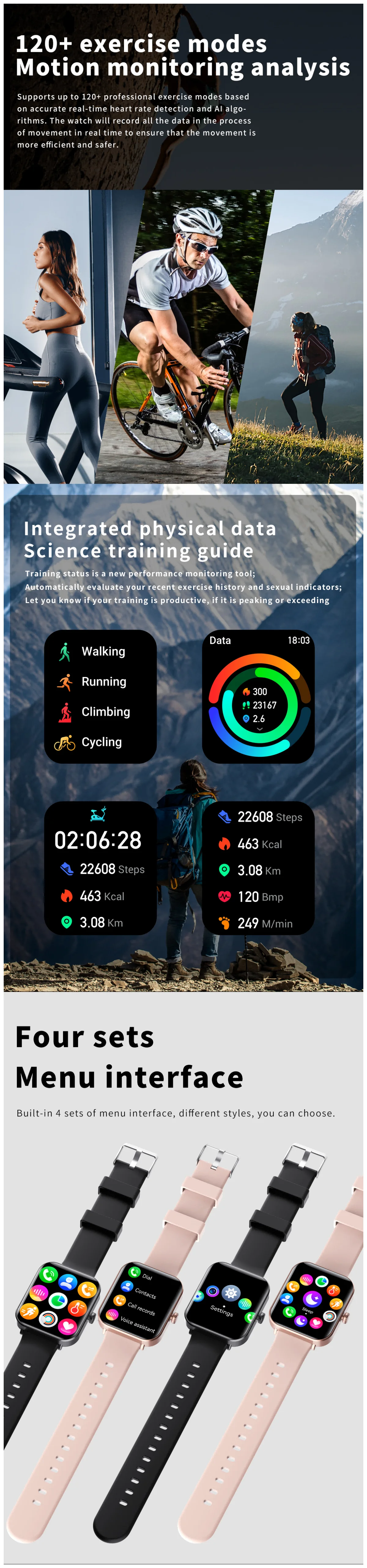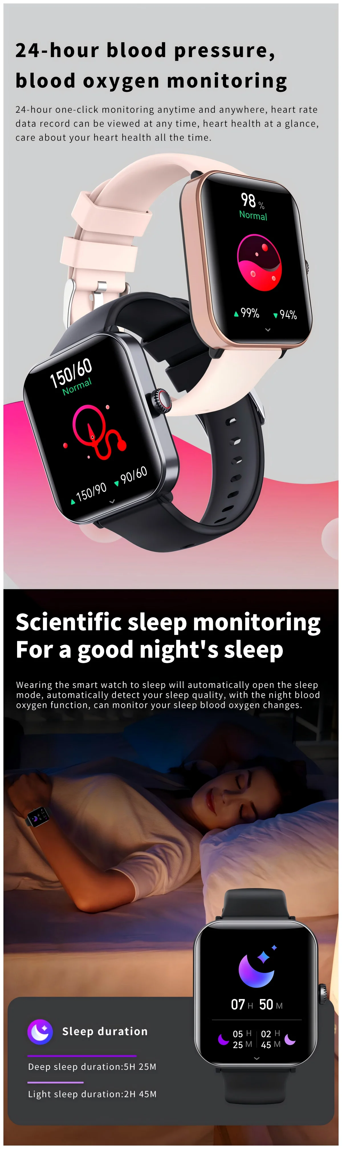 Key functions: Pedometer, distance, calorie, call, voice assistant, heart rate, blood oxygen, blood pressure test, sleep monitoring, music playback, stopwatch, timer, calculator, weather display, female menstrual period function, remote camera, payment code, business card , Raise the wrist to turn on the screen, flashlight, find the phone and other incoming call reminders (caller number/name), message reminders, alarm clock reminders, sedentary reminders, drinking water reminders, etc