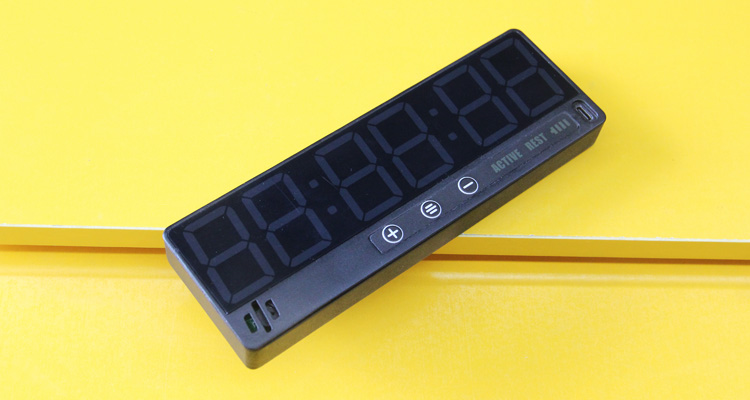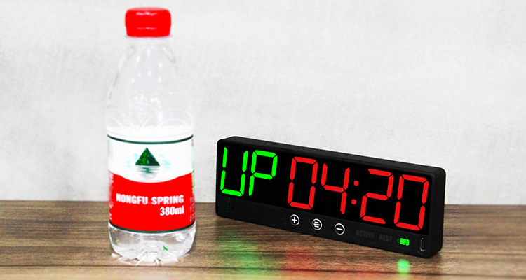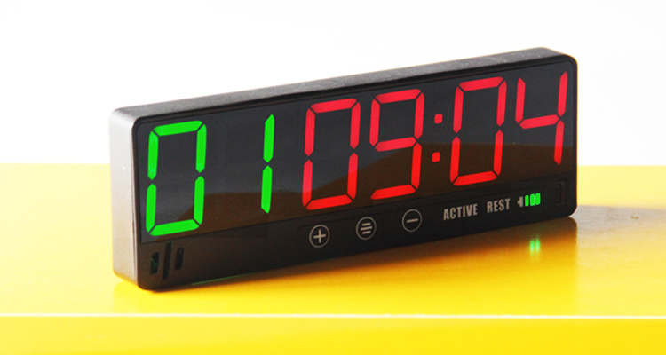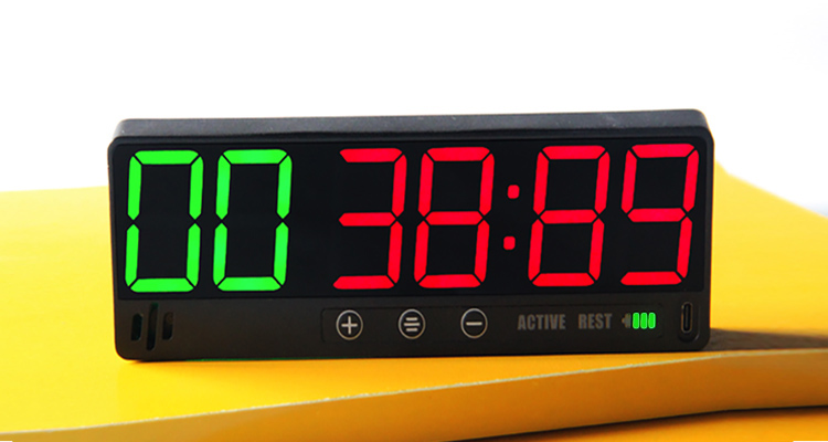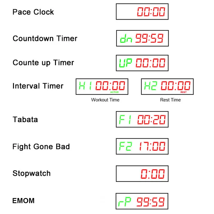 2. Countdown timer: programmable, max from 99:59 to zero 3. Countup timer: programmable, from zero to max 99:59 4. Interval timer: programmable, custom set EMOM, HIIT, AMRAP max set 99 rounds, 99:59 workout and rest time. 5. Tabata:pre-set interval timer. 6. Fight Gone Bad: pre-set interval timer. 7. Stopwatch: count up from zero to 99:59:99. 8. 10 second countdown preparation.