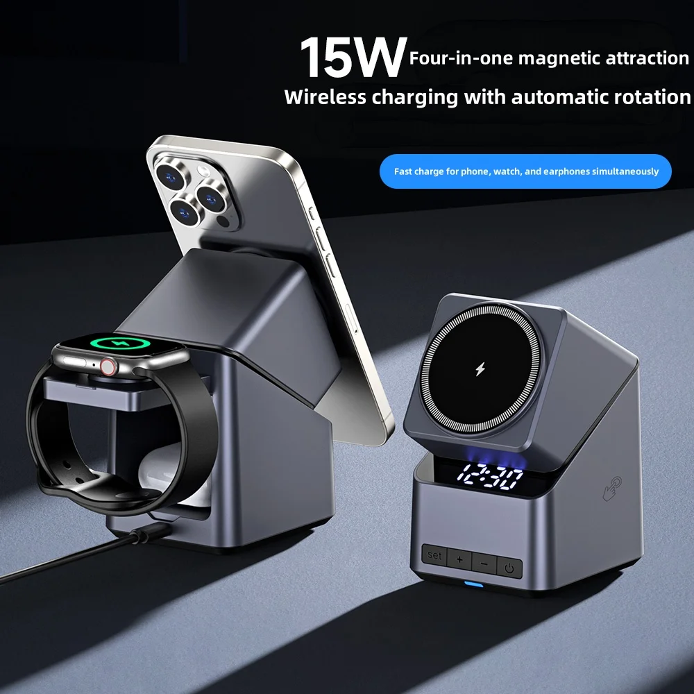 Corporate Gift Set Luxury 360 Rotation 3 in 1 Rotating Charger Cargador Inalambrico With Alarm Clock Hot Sale 15W Custom Logo