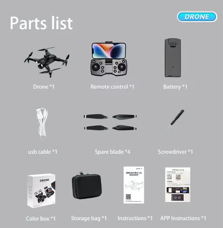 drone*1, remote control*1, spare fan blades*4, storage bag*1