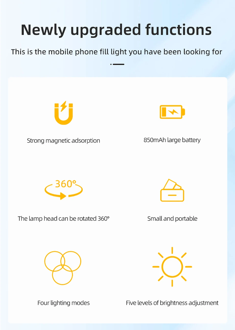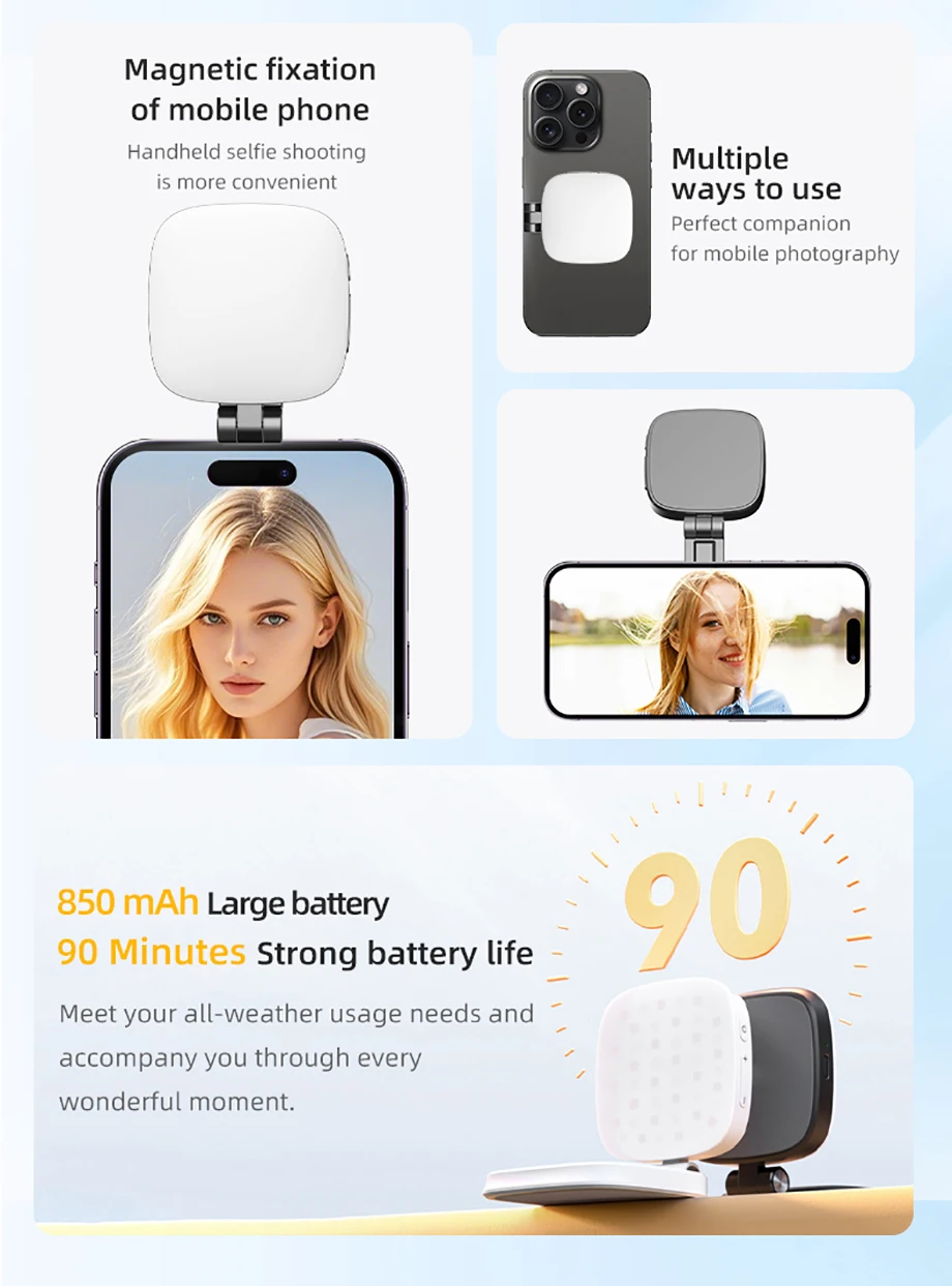 The F662 Adjustable Portable Phone Magnetic Selfie Light offers versatile, high-quality LED lighting ideal for outdoor photography, makeup application, and YouTube content creation. Its compact, pocket-sized design includes a magnetic attachment for effortless placement on your phone, ensuring stable and adjustable illumination. This fill light enhances facial features and reduces shadows, delivering professional-grade results wherever you go. Perfect for studio and on-the-move shooting, it provides reliable, adjustable brightness to suit various lighting environments and creative needs.