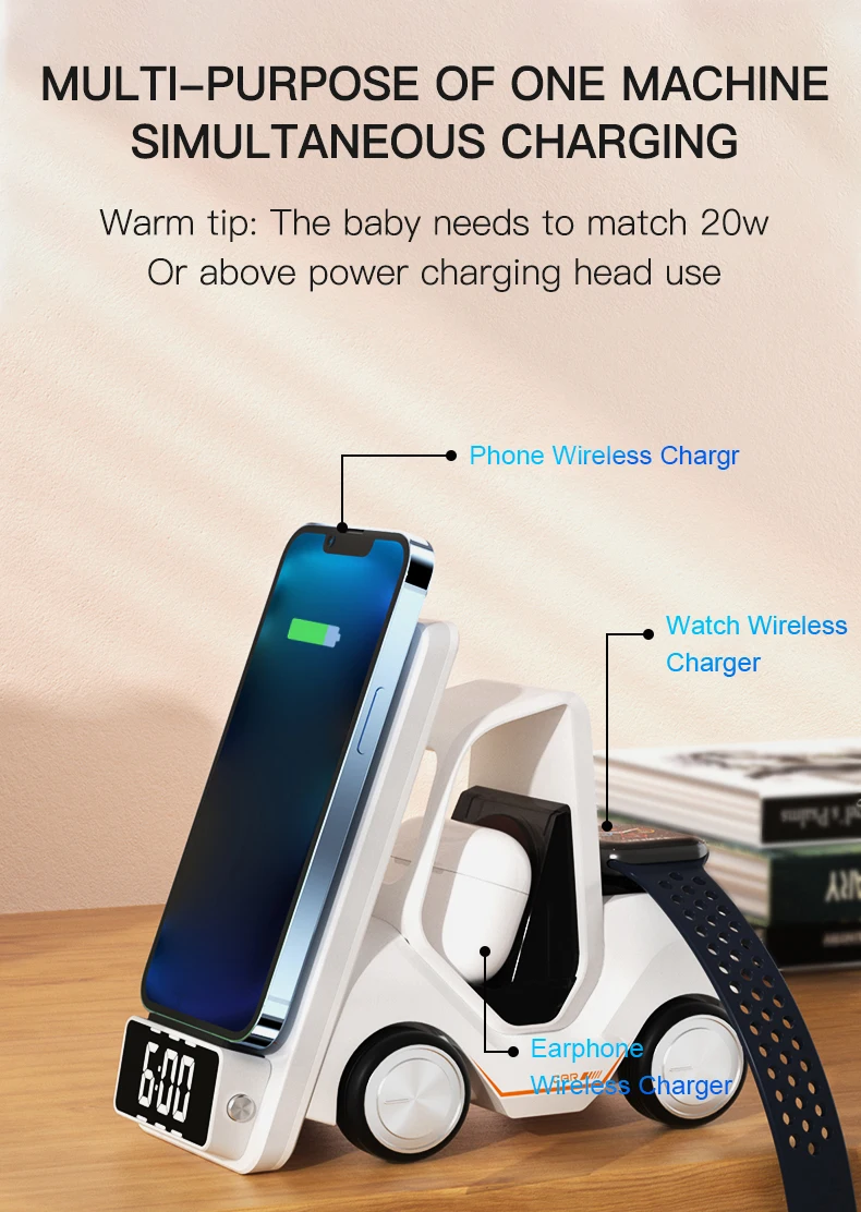 Forklift Model Led Digital Display Clock Wireless Charger Phone Holder Car 3 in 1 Wireless Charging Station