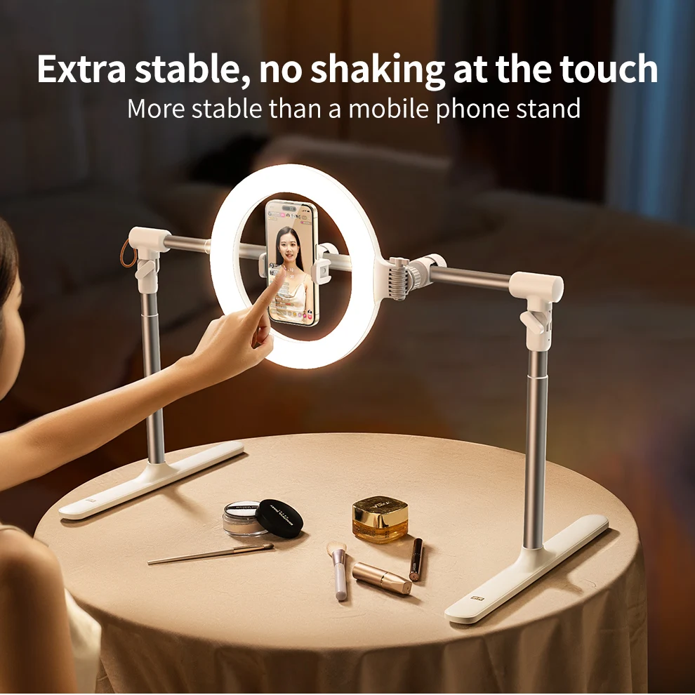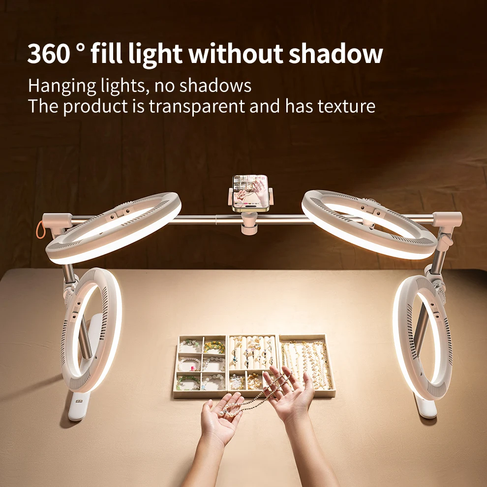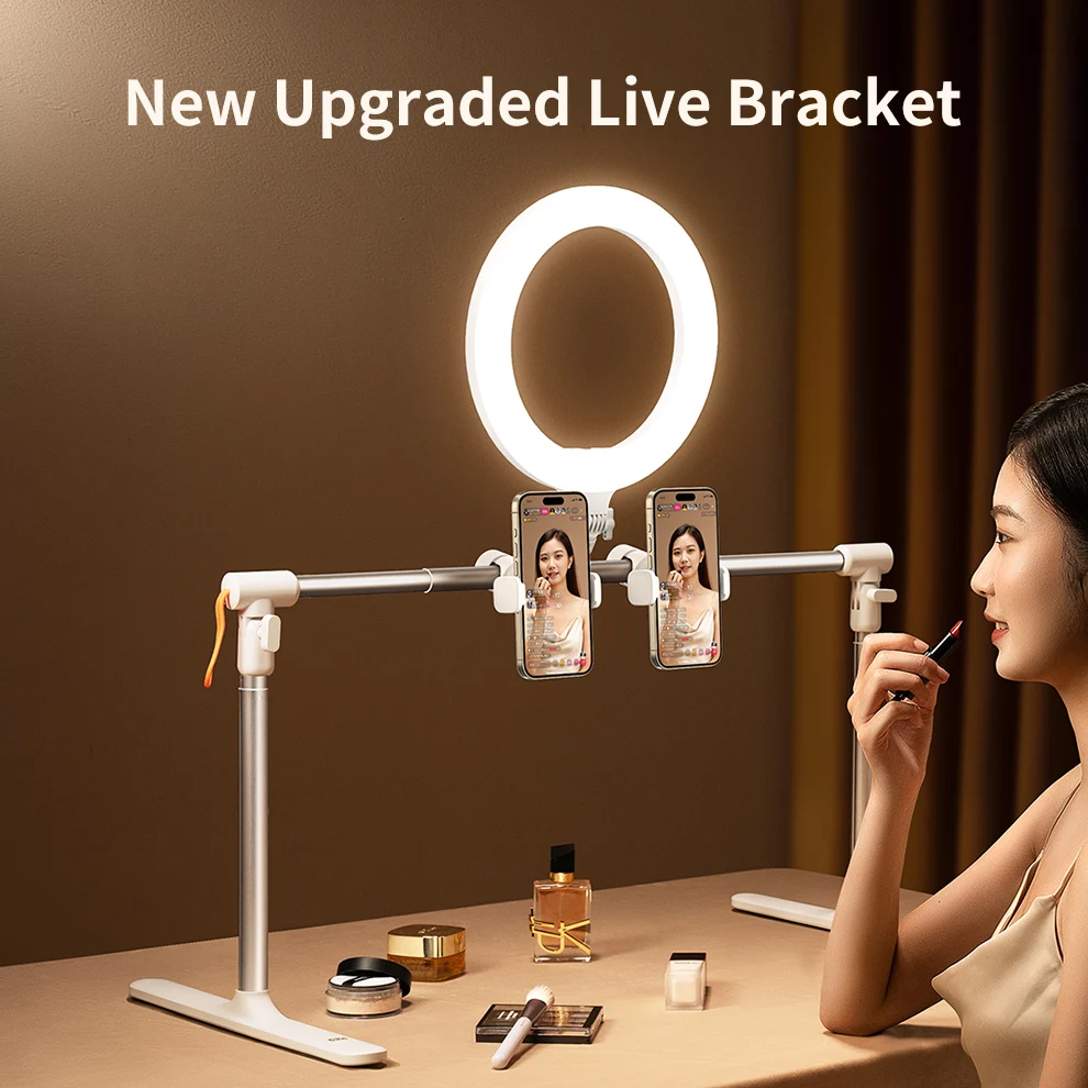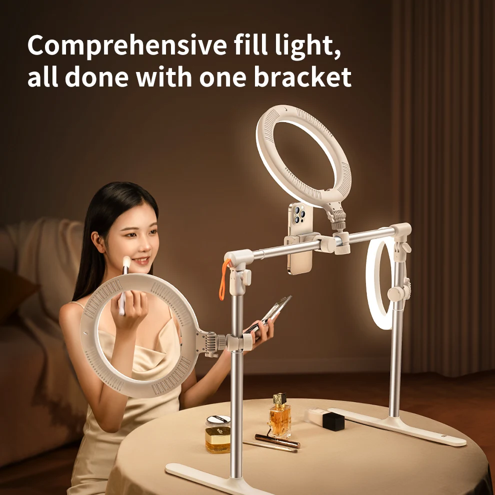 Enhance your content creation with the Jopree F5 Live Makeup Flexible Multi-Functional LED Ring Light. Designed for flawless illumination, it features adjustable soft lighting that reduces shadows and highlights your best angles. Equipped with a flexible overhead bracket and integrated phone holder, it offers versatile positioning for live streaming, makeup application, or selfies. This all-in-one setup ensures professional-quality lighting, making it ideal for creators seeking precise control and convenience.