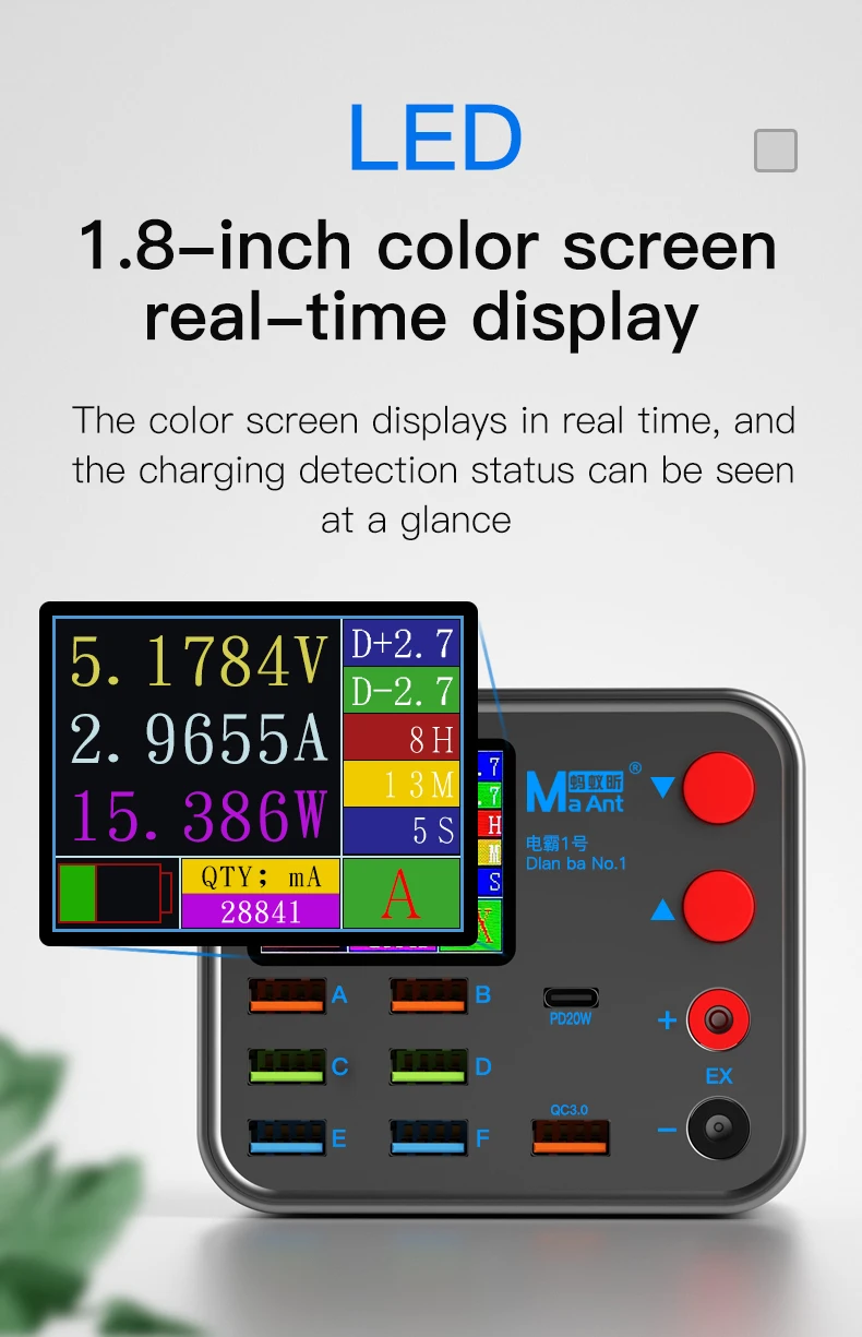 2. 1.8-inch color LCD display, voltage, current, power, time and battery are fully displayed in real-time.