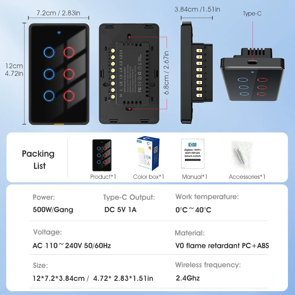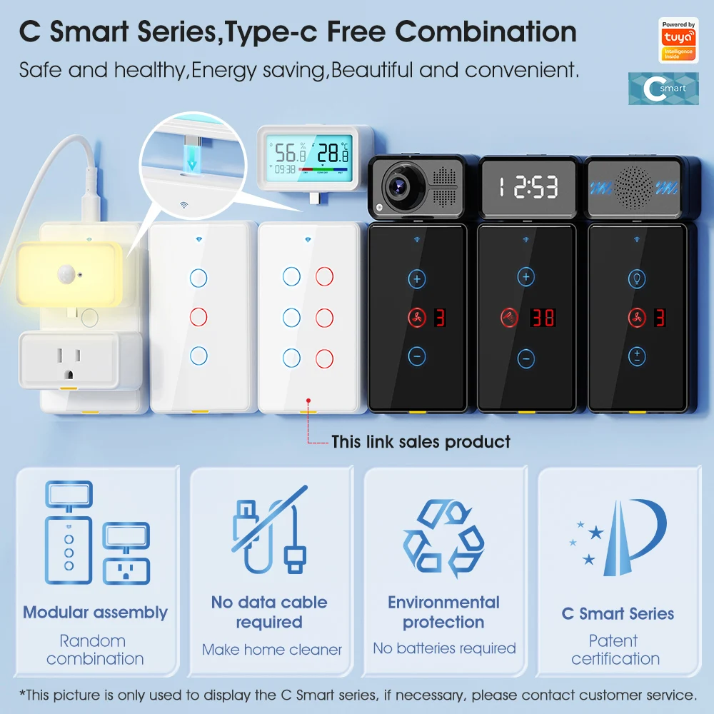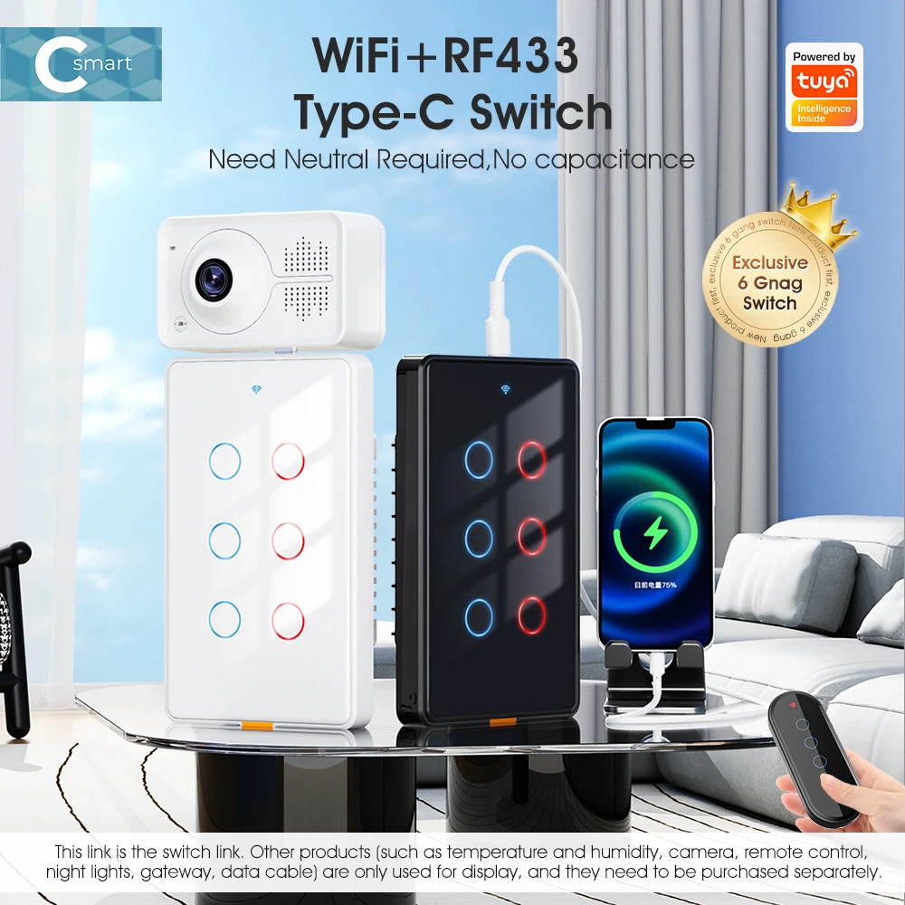 "C smart" series, smart accessories are used with Type-C powered "C smart" switches and sockets and other equipment. No data cable is required. The advanced design concept integrates beauty and technology. It is easy to install and does not occupy the socket location. Farewell The desktop is cluttered due to too many data cables. --【Modular assembly, customized combination】 Type-C interface design is a very convenient and flexible interface standard that can be plugged in and used. In order to ensure the overall beauty of the home, we have designed a complete set of smart products, including smart doorbells, night lights, switches, sockets, temperature and humidity, presence sensors, cameras and other smart security sensors. As long as you replace the old switches or sockets at home with our "C smart" series, it is so easy to install the series of accessories. Wherever you need them, the elderly and children can install them. Just plug in and pull out, and it is easy to install. --【Exclusive 6Gang switch】 We have developed a unique 6Gang switch, which adopts American standard sizes and requires no additional digging for installation. It is seamlessly connected with the traditional bottom box to meet your various use needs to the greatest extent and make life more convenient. --【Partition design, double insurance, safer】 1. At the switch wiring, we set up a circuit isolation board to avoid the intersection of lines, effectively eliminating the problem of short circuit caused by no baffle. 2. We also installed an isolation board between the switch panel and the circuit board to avoid direct contact with the circuit board, which helps to protect the equipment, protect your safety, and give you more peace of mind. --【2.5D curved tempered glass panel】 Elegant appearance, classic colors can better match any home style. The panel is made of 2.5D curved tempered glass, with smooth paint on the sides. The overall feel is delicate and easy to clean. It is also moisture-proof, allowing it to work in humid conditions, preventing most accidents, making it durable and safe to use. (Only the black model uses smooth paint) --【Voice and mobile APP control】 After connecting to the smart gateway, you can easily control our smart switch with voice through Tmall Genie, Alexa, and Google Home Assistant. Connect to the Tuya APP on your mobile phone and simply configure it to start your smart home journey, enjoy smart life and free your hands. --【RF433] In addition to voice and mobile phone, our switches also support RF433 remote control control, with an ultra-long sensing distance of 100 meters without barriers. A variety of control methods are available for you to choose from. --【Indicator light and fluorescent strip design】 The switch indicator light uses red and blue lights to distinguish the switch status. The backlight can be turned off through the APP at night. But there is no need to worry. The bottom of the switch is thoughtfully equipped with a fluorescent strip, which emits a faint reminder so that you can easily find the switch position at night. At the same time, the brightness of the light strip is moderate and will not affect your sleep. --【Timing function】 Timing can be set according to personal habits to automatically control the switch, supporting timing, countdown, cycle timing, random timing, and inching timing. It can help us make rational use of electrical appliances and avoid long-term unnecessary use, thereby extending product life and saving power consumption.(6Gang only has timing and countdown) --【Multi-control association】 The multi-control association function allows you to turn off or turn on multiple smart switches with one click, avoiding energy waste caused by forgetting to turn off the switches. For example, when you leave home, you only need to turn off all smart switches with one click through the mobile APP to ensure that all electrical equipment is turned off and save electricity. It provides a more convenient, flexible, energy-saving, safe and reliable use experience, making smart home management more intelligent and efficient. --【A variety of functions】 1. Three states: On by default, off by default, memory function. For example, the smart switch power-off memory function can record the last state of use. When the power is turned on again after a power outage, the switch will automatically restore to the previous state without resetting, saving the user's time and energy and improving convenience of use. You can also set the device status after power off and on again. 2. Change the button name: Change the name of the corresponding light controlled by each button in the APP for easy identification. 3. Offline reminder: Our smart switches also have a device offline reminder function, which can help users understand device status in a timely manner, improve device management efficiency, and effectively prevent device failures. 4.Device sharing: Through the device sharing function, every family member can easily enjoy the convenience of smart switches through their mobile phones. 5.Group control: Set up groups for smart switches and control multiple smart devices with a single command through the app. For example, set up a "sleep group" and when you want to sleep, you can turn off all devices in the group at the same time with just one click.