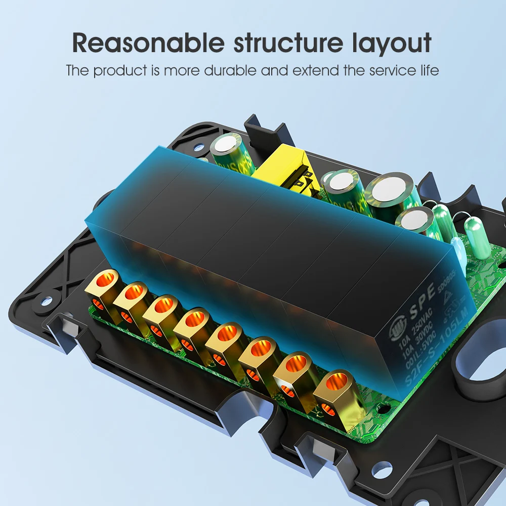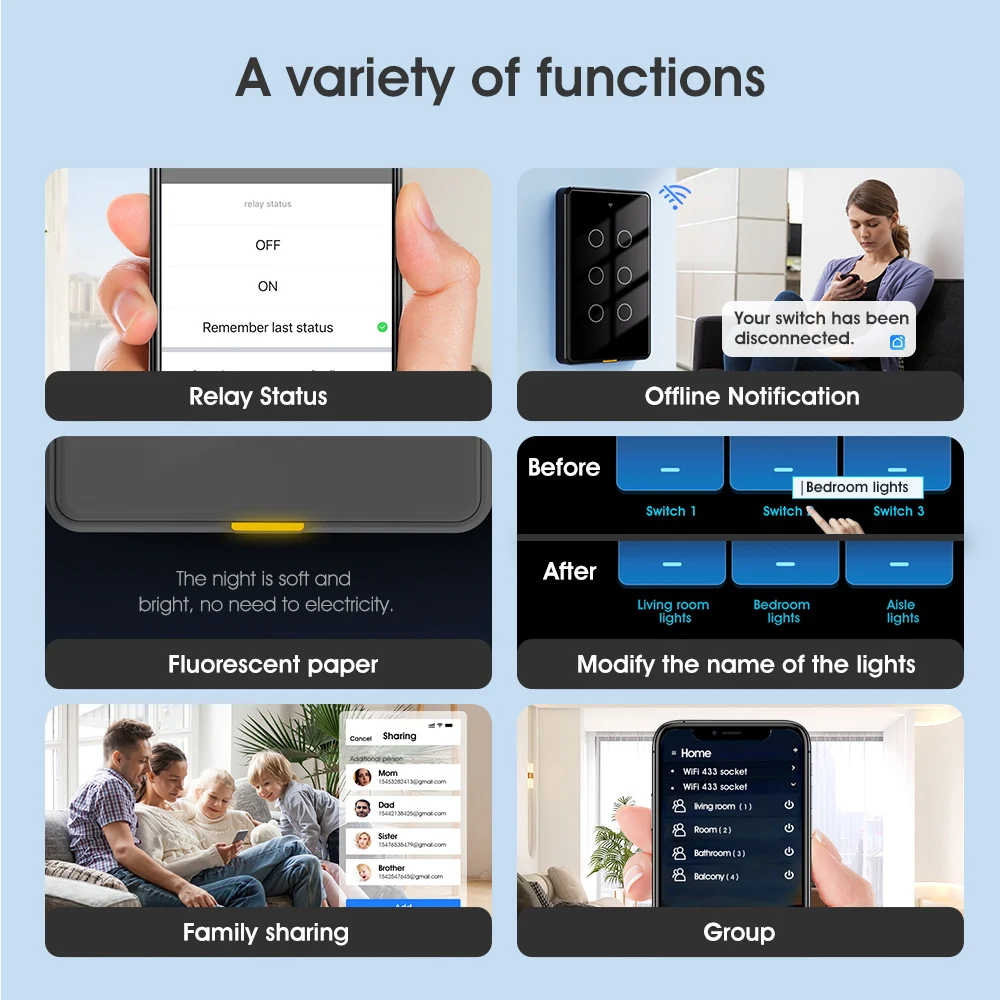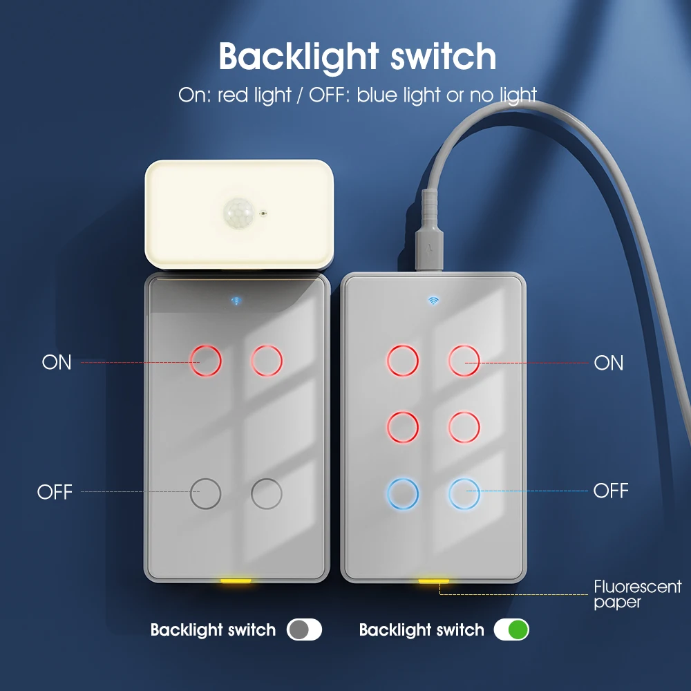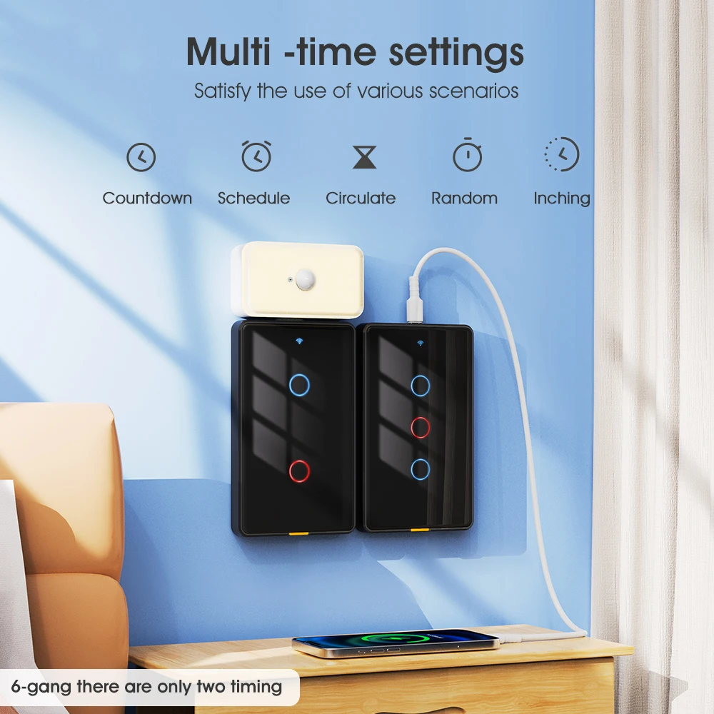 "C smart" series, smart accessories are used with Type-C powered "C smart" switches and sockets and other equipment. No data cable is required. The advanced design concept integrates beauty and technology. It is easy to install and does not occupy the socket location. Farewell The desktop is cluttered due to too many data cables. --【Modular assembly, customized combination】 Type-C interface design is a very convenient and flexible interface standard that can be plugged in and used. In order to ensure the overall beauty of the home, we have designed a complete set of smart products, including smart doorbells, night lights, switches, sockets, temperature and humidity, presence sensors, cameras and other smart security sensors. As long as you replace the old switches or sockets at home with our "C smart" series, it is so easy to install the series of accessories. Wherever you need them, the elderly and children can install them. Just plug in and pull out, and it is easy to install. --【Exclusive 6Gang switch】 We have developed a unique 6Gang switch, which adopts American standard sizes and requires no additional digging for installation. It is seamlessly connected with the traditional bottom box to meet your various use needs to the greatest extent and make life more convenient. --【Partition design, double insurance, safer】 1. At the switch wiring, we set up a circuit isolation board to avoid the intersection of lines, effectively eliminating the problem of short circuit caused by no baffle. 2. We also installed an isolation board between the switch panel and the circuit board to avoid direct contact with the circuit board, which helps to protect the equipment, protect your safety, and give you more peace of mind. --【2.5D curved tempered glass panel】 Elegant appearance, classic colors can better match any home style. The panel is made of 2.5D curved tempered glass, with smooth paint on the sides. The overall feel is delicate and easy to clean. It is also moisture-proof, allowing it to work in humid conditions, preventing most accidents, making it durable and safe to use. (Only the black model uses smooth paint) --【Voice and mobile APP control】 After connecting to the smart gateway, you can easily control our smart switch with voice through Tmall Genie, Alexa, and Google Home Assistant. Connect to the Tuya APP on your mobile phone and simply configure it to start your smart home journey, enjoy smart life and free your hands. --【RF433] In addition to voice and mobile phone, our switches also support RF433 remote control control, with an ultra-long sensing distance of 100 meters without barriers. A variety of control methods are available for you to choose from. --【Indicator light and fluorescent strip design】 The switch indicator light uses red and blue lights to distinguish the switch status. The backlight can be turned off through the APP at night. But there is no need to worry. The bottom of the switch is thoughtfully equipped with a fluorescent strip, which emits a faint reminder so that you can easily find the switch position at night. At the same time, the brightness of the light strip is moderate and will not affect your sleep. --【Timing function】 Timing can be set according to personal habits to automatically control the switch, supporting timing, countdown, cycle timing, random timing, and inching timing. It can help us make rational use of electrical appliances and avoid long-term unnecessary use, thereby extending product life and saving power consumption.(6Gang only has timing and countdown) --【Multi-control association】 The multi-control association function allows you to turn off or turn on multiple smart switches with one click, avoiding energy waste caused by forgetting to turn off the switches. For example, when you leave home, you only need to turn off all smart switches with one click through the mobile APP to ensure that all electrical equipment is turned off and save electricity. It provides a more convenient, flexible, energy-saving, safe and reliable use experience, making smart home management more intelligent and efficient. --【A variety of functions】 1. Three states: On by default, off by default, memory function. For example, the smart switch power-off memory function can record the last state of use. When the power is turned on again after a power outage, the switch will automatically restore to the previous state without resetting, saving the user's time and energy and improving convenience of use. You can also set the device status after power off and on again. 2. Change the button name: Change the name of the corresponding light controlled by each button in the APP for easy identification. 3. Offline reminder: Our smart switches also have a device offline reminder function, which can help users understand device status in a timely manner, improve device management efficiency, and effectively prevent device failures. 4.Device sharing: Through the device sharing function, every family member can easily enjoy the convenience of smart switches through their mobile phones. 5.Group control: Set up groups for smart switches and control multiple smart devices with a single command through the app. For example, set up a "sleep group" and when you want to sleep, you can turn off all devices in the group at the same time with just one click.