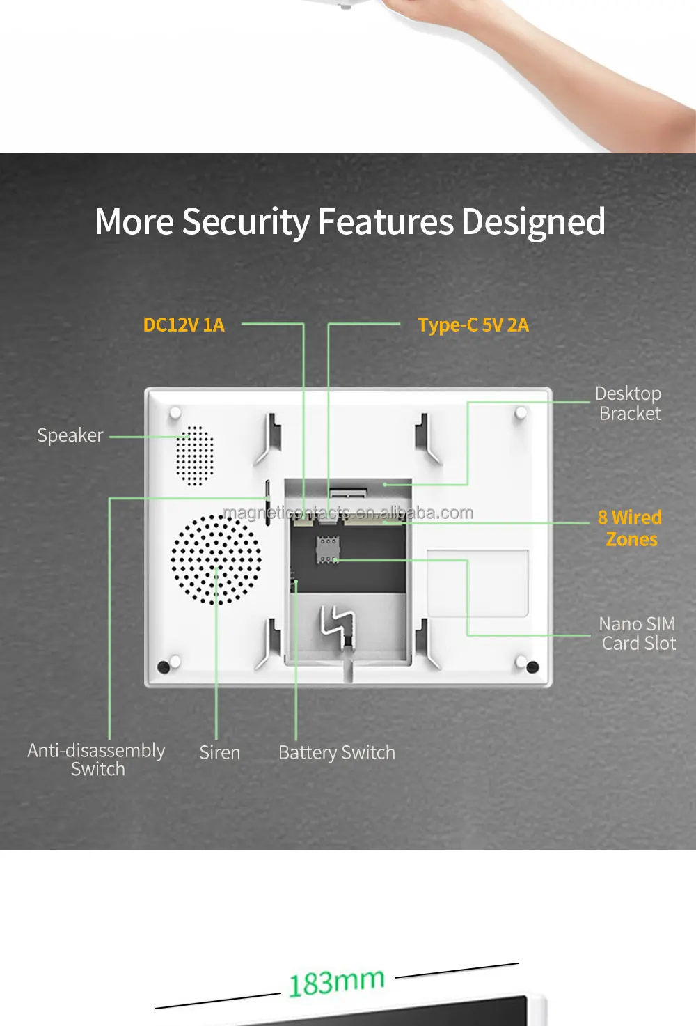 2. DC 12V/1A port and 8 Wired Sensors suitable for families with pre-installed embedded lines.