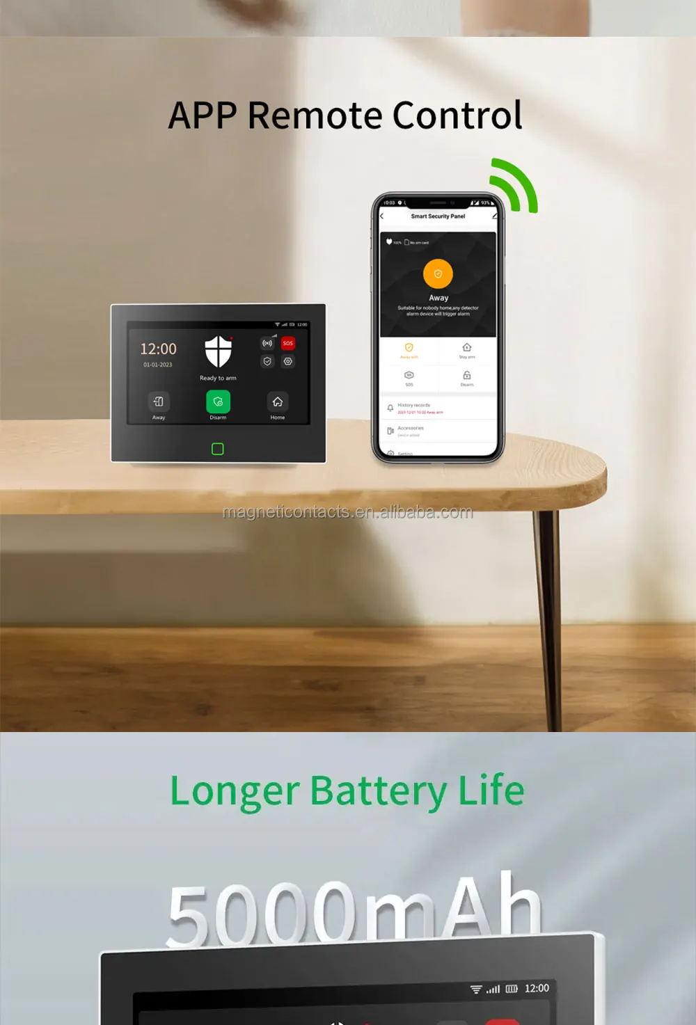 - After connecting the alarm panel to the mobile APP, the mobile phone can remotely control the panel to arm/disarm, and view the door and window switches in real-time.
