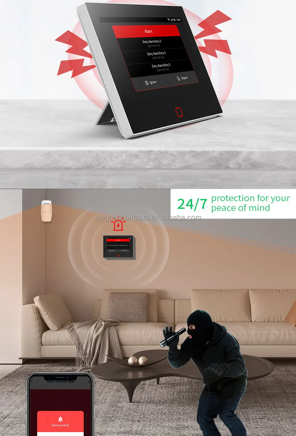 If someone breaks into your home, the door and window sensors and motion sensors will send a signal to the security panel, and the security panel and the siren will alarm, and your mobile phone APP will receive an alarm prompt to keep you informed about the family status.