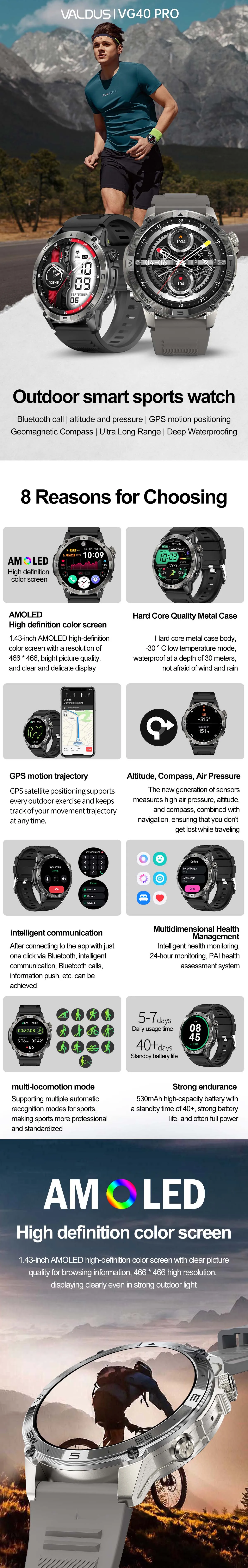 VALDUS 1.43 Inch AMOLED Round Screen Waterproof IP68 Bluetooth Call Smartwatch NFC GPS Heart Rate Monitor VG40 PRO Smart Watch